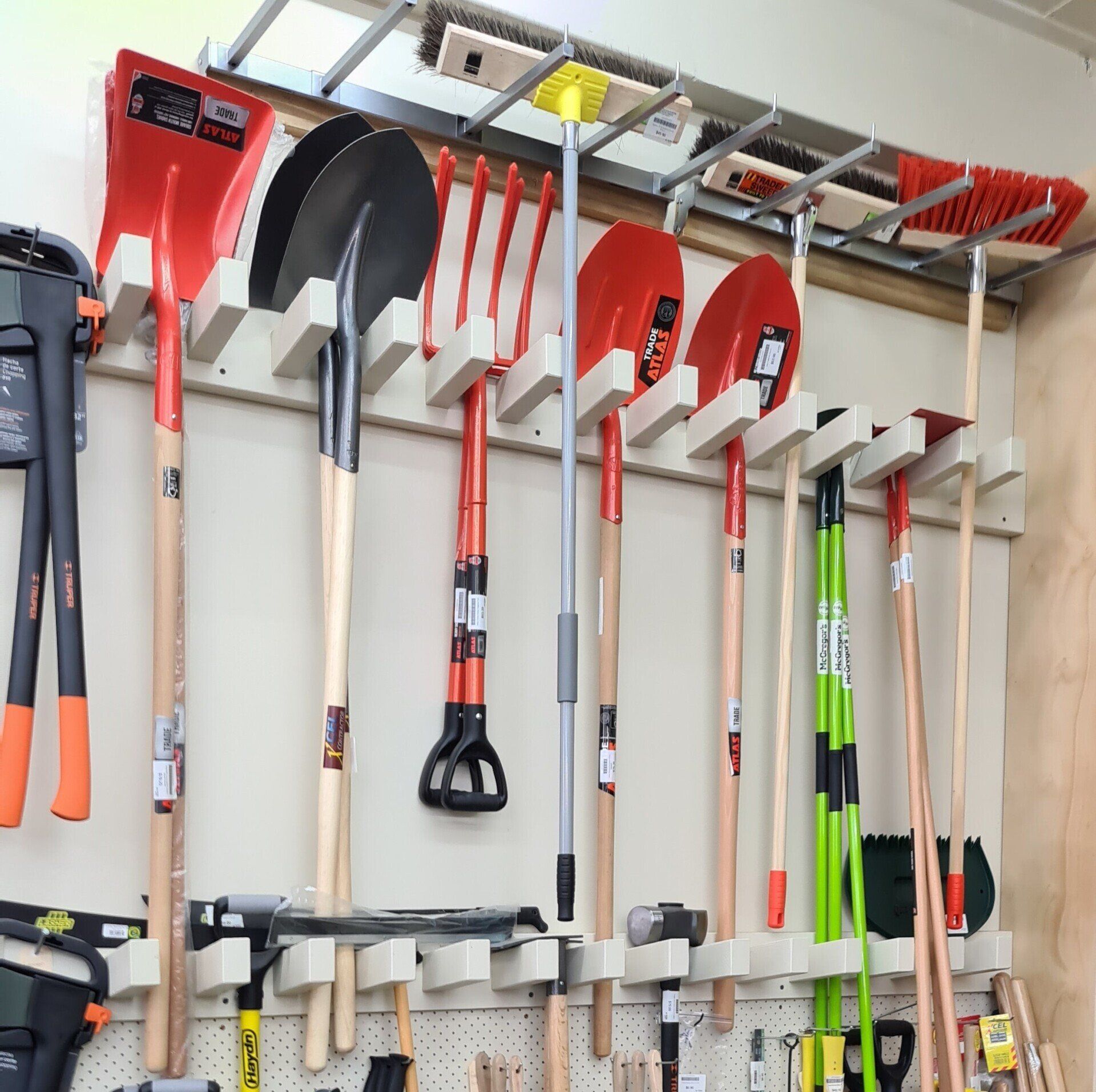 We have spades, shovels, digging forks, hoes, trowels, cultivators, secateurs, loppers, and axes.